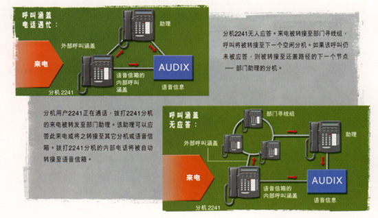 當(dāng)最初的被叫方不能接聽(tīng)來(lái)話時(shí),呼叫涵蓋功能可將來(lái)話轉(zhuǎn)接到另外一個(gè)分機(jī)。您可以自行規(guī)定判斷是否轉(zhuǎn)接的標(biāo)準(zhǔn)以及涵蓋通道的條件,如無(wú)應(yīng)答、 無(wú)此號(hào)碼、遇忙籌。DEFINITY BCS還可以識(shí)別內(nèi)部和外部呼叫,并為其提供不同的涵蓋通道。