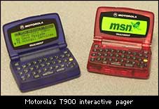“Talkabout T900”是摩托羅拉公司為微軟MSN專門設計生產(chǎn)的一種雙向?qū)ず魴C,它由一個緊湊型的小鍵盤和一個可以容納4行消息的屏幕組成,設計小巧,攜帶方便,可以方便用戶收發(fā)MSN提供的Hotmail免費郵件服務、接收短消息以及訪問MSN上的其它服務,比如及時的股市行情、警示消息等等。