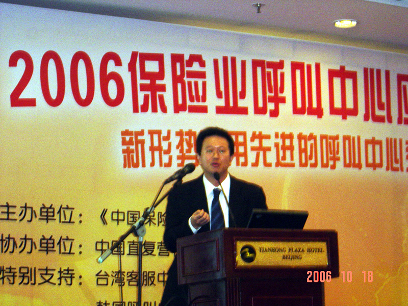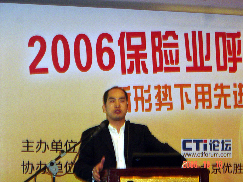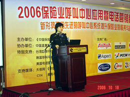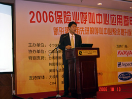 。。2006年10月18日,2006保險(xiǎn)業(yè)呼叫中心應(yīng)用暨電話營銷高峰研討會在北京天鴻科園大酒店隆重召開,以下是大會主題演講的相關(guān)圖片報(bào)道:
