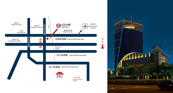 路線1 北京首都國際機場—遼寧大廈 自駕:機場高速—四元橋—北四環(huán)—保福寺橋(40-50分鐘) 機場大巴:可從航站樓直接搭乘機場大巴中關(guān)村線,到總站下車后向東步行200米即到 地鐵:機場快線到三元橋,換乘10號線,知春里下車后換乘630到保福寺橋南 路線2 北京西站—遼寧大廈 自駕:西三環(huán)至北三環(huán)聯(lián)想橋,向北行至保福寺橋,右轉(zhuǎn)即到(30分鐘) 路線3 北京南站—遼寧大廈 自駕:南二環(huán)至西直門向北到北四環(huán)學院橋左轉(zhuǎn),保福寺橋掉頭即到 周邊住宿 格林豪泰酒店(學院路店) 地址:北京市海淀區(qū)展春園西路2號 電話:(010)82379998, 4006998998 如家快捷酒店(北京清華大學東門店) 地址:北京市海淀區(qū)雙清路16號(清華大學東門的東北方向2公里處) 電話:(010)82411980 速8酒店北京學院路店 地址:北京市海淀區(qū)志新西路3-1號(近學院橋北) 電話:(010)51971889 |