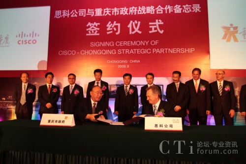 CTI論壇(ctiforum)9月14日消息:2009年9月11日,重慶市人民政府與思科正式簽訂合作備忘錄,雙方將結(jié)為戰(zhàn)略合作伙伴關(guān)系,就通信產(chǎn)品制造、“智能+互聯(lián)城市”試點(diǎn)示范、綠色技術(shù)研發(fā)與創(chuàng)新及風(fēng)險(xiǎn)投資等多方面展開(kāi)深入合作。此次合作將進(jìn)一步加快重慶市產(chǎn)業(yè)結(jié)構(gòu)和產(chǎn)品結(jié)構(gòu)調(diào)整,促進(jìn)內(nèi)陸開(kāi)放城市建設(shè);加快發(fā)展重慶通信產(chǎn)品產(chǎn)業(yè)集群,把重慶建設(shè)成為西部重要的現(xiàn)代通信產(chǎn)品制造基地;推動(dòng)以信息產(chǎn)業(yè)為主體的重慶高新技術(shù)產(chǎn)業(yè)發(fā)展以及本土創(chuàng)新和可持續(xù)性能力的提供,更高效便捷地加快本土企業(yè)的國(guó)際化進(jìn)程;整合多方國(guó)際資源,以推進(jìn)重慶在中國(guó)率先成為“智能+互聯(lián)城市”,讓市民享受更多的工作和生活便利及實(shí)惠。作為思科在華創(chuàng)新及可持續(xù)發(fā)展戰(zhàn)略實(shí)施的又一里程碑,此次合作不僅是思科“智能+互聯(lián)城市”計(jì)劃在中國(guó)與當(dāng)?shù)卣氖锥群献黜?xiàng)目,也是思科在“協(xié)作型創(chuàng)新模式”指導(dǎo)下激勵(lì)本土創(chuàng)新的全新實(shí)踐。