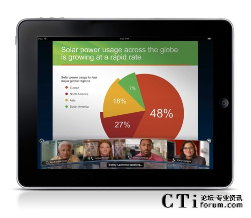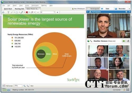 隨著支持高質(zhì)量視頻的思科WebEx™ Meeting Center的推出,與會(huì)者將能夠在全屏視頻模式下非常清晰的看到其他與會(huì)人員,從而使網(wǎng)絡(luò)會(huì)議變成一個(gè)虛擬視頻會(huì)議室。除了能夠通過(guò)高清晰度的全屏顯示看到發(fā)言者外,用戶還能同時(shí)共享桌面,并通過(guò)思科的 WebEx One Touch輕松接入思科網(wǎng)真會(huì)議。思科WebEx還提供ActivePresence功能,可沿屏幕底部以條狀顯示所有與會(huì)者。當(dāng)前的發(fā)言者以全屏顯示,并保持與參會(huì)者之間的視頻交互。借助語(yǔ)音激活轉(zhuǎn)換功能,當(dāng)另一個(gè)與會(huì)者開(kāi)始發(fā)言時(shí),他將被轉(zhuǎn)為全屏顯示狀態(tài)。思科網(wǎng)真終端也支持ActivePresence功能。