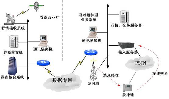 最終我們的設想是類似于呼叫中心的外包方式,由尋呼臺建立一套短訊接入系統(tǒng),并與券商的交易系統(tǒng)聯(lián)網(通過交易前置機),各券商租用部分資源,同時給他們的股民提供股神通話機,股民們一方面可通過尋呼臺的無線資源接收股市信息,另一方面可以通過電話線接入尋呼的交易系統(tǒng)進行交易。