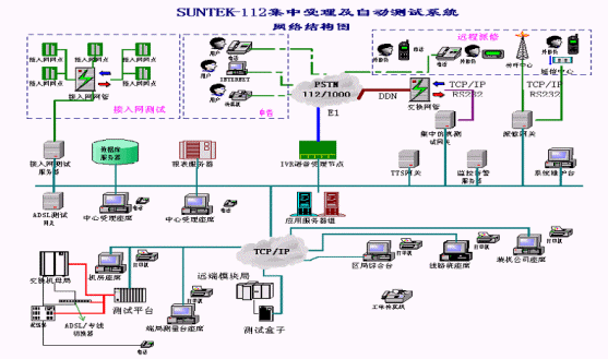 系統(tǒng)在設(shè)計時采用集中受理、分布測量的結(jié)構(gòu)化、模塊化設(shè)計:受理中心進行112的集中受理和業(yè)務(wù)處理,端局完成相應(yīng)用戶線的測試功能,所有測試數(shù)據(jù)等均送至受理中心。系統(tǒng)測試準確、任務(wù)分擔(dān)、負荷均衡,處理速度快,性能可靠。系統(tǒng)的受理模塊和測試模塊相互協(xié)調(diào)又各自獨立,使二者可以統(tǒng)一地作為SUNTEKTM-112集中受理及自動測試系統(tǒng),又能各自作為子系統(tǒng)與其它廠家(112系統(tǒng)、97系統(tǒng)、1000號等)的產(chǎn)品結(jié)合起來為112系統(tǒng)服務(wù)。系統(tǒng)網(wǎng)絡(luò)結(jié)構(gòu)圖如下所示: