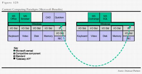 今天,由于業(yè)內(nèi)各企業(yè)普遍明白了控制價(jià)值鏈中操作平臺(tái)和應(yīng)用平臺(tái)的重要性,因此靠壟斷本身來(lái)贏利容易受到全行業(yè)的抵制,微軟的策略是在操作平臺(tái)和應(yīng)用平臺(tái)上形成壟斷后,靠應(yīng)用來(lái)贏利,這樣大大增加了贏利的隱蔽性,業(yè)界比較容易接受!
