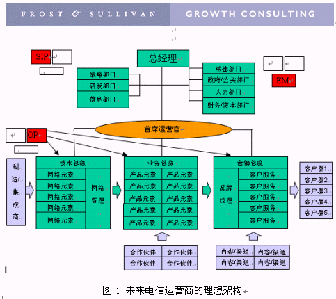 Frost & Sullivan(中國)公司深入研究國際主流運營商的組織結(jié)構(gòu)與管理模式,同時參考了國際上公認的eTOM模型,并結(jié)合國內(nèi)電信運營商組織結(jié)構(gòu)的現(xiàn)狀,提出了圖1所示的未來電信運營商的理想架構(gòu)。理想架構(gòu)的確定對電信運營管理的變革具有重要的意義。只有事先明確了方向,并且對未來達成了廣泛一致的共識,才能對目標過程進行分解,有步驟、有方法、有成效的完成目標。