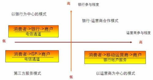 從產(chǎn)業(yè)鏈環(huán)節(jié)上看,移動支付的主要參與者主要包括:消費者、平臺提供商、銀行、運營商和商戶。其中,銀行和運營商在其中具有較高的談判能力。因此,可以按照這兩者在產(chǎn)業(yè)鏈中的參與程度,劃分移動支付的商業(yè)模式?偟膩碚f,銀行機構管理著廣大用戶的資金帳戶,擁有完善的支付體系,在支付領域具有天然的用戶信任。運營商則擁有完備的網(wǎng)絡設施和先進的IT系統(tǒng),通過定制終端,運營商可以將各種先進的移動應用提供給用戶,使用戶獲得良好的移動化生活體驗。因此,運營商在這方面具有較好的用戶資源和營銷渠道。