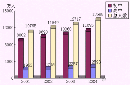 2001年,中國大陸中學學生人數(shù)已達10765萬人,而且學生人數(shù)還在快速增長。初中學生人數(shù)以每年6.5%的速度增長,普通高中學生人數(shù)也以每年10%-11%的速度增長?梢钥闯觯逃袌鼍薮蟮臐摿蜕虣C。