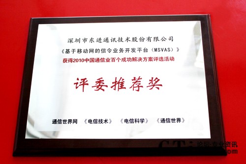 從2010年7月起評(píng)選進(jìn)入征集階段,經(jīng)過(guò)長(zhǎng)達(dá)3個(gè)月的層層篩選,最終百個(gè)成功解決方案出爐,并由多家主流媒體公示。東進(jìn)技術(shù)“基于移動(dòng)網(wǎng)的信令業(yè)務(wù)開(kāi)發(fā)平臺(tái)(MSVAS)”解決方案憑借出眾的實(shí)用經(jīng)濟(jì)性、安全可靠性、靈活性和成熟性,經(jīng)過(guò)兩個(gè)月網(wǎng)絡(luò)初選,和近百位運(yùn)營(yíng)商層面專業(yè)人士組成的組委會(huì)技術(shù)終選后獲此殊榮。