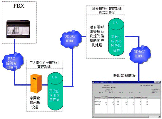 一般來說,各大有能力推出PBX產(chǎn)品的通訊廠商都有自己專用的呼叫管理系統(tǒng)。這些專用的呼叫管理系統(tǒng)可以直接從PBX獲取最高效的消息,而不用通過CTI SERVER。當然,這些專用的呼叫管理系統(tǒng)也只能應用于專門的PBX產(chǎn)品。 如果運營商在選購設備的時候,已經(jīng)選購了專用的呼叫管理系統(tǒng),那么開發(fā)商可以對這個專門的呼叫管理系統(tǒng)進行二次開發(fā)。請看下面的數(shù)據(jù)流程圖: