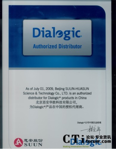 2009年7月1日DIALOGIC公司為其大陸地區(qū)DIALOGIC產(chǎn)品總代理-------北京思安華勝科技有限公司頒發(fā)了09版的代理證書,新的代理證書不僅在版面和內(nèi)容上與以往有所不同,更重要的是說明了代理的產(chǎn)品范圍(由于新近收購的NMS、Cantata等產(chǎn)品,國內(nèi)原來就有代理商,現(xiàn)在所有產(chǎn)品都在Dialogic旗下,為了避免發(fā)生混淆和誤會,本次的代理證書增加了附頁,附頁里面規(guī)定了代理商所代理的產(chǎn)品的范圍,我們歡迎朋友們以各種形式來我公司或Dialogic公司北京代表處咨詢和驗(yàn)證)。此舉強(qiáng)調(diào)了渠道的正規(guī)性和權(quán)威性,北京思安華勝公司目前是DIALOGIC公司原DIALOGIC系列產(chǎn)品在中國的唯一總代理,承擔(dān)著Dialogic系列產(chǎn)品的銷售、市場推廣、技術(shù)支持、售后服務(wù)、保修服務(wù)等一系列重要工作。