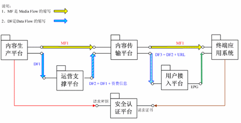 系統(tǒng)根據功能可分成內容制作、節(jié)目傳輸、安全認證、計費營業(yè)、接入處理和終端六個部分。整個系統(tǒng)始終貫穿媒體流和數據流,確保各個部分能夠有效的協作。