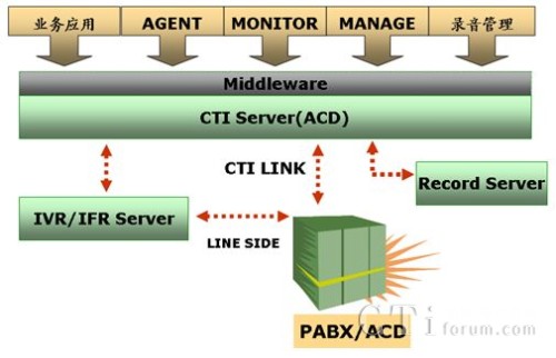 聯(lián)絡(luò)中心主要由電話呼叫分配(PBX/ACD)、計(jì)算機(jī)電話集成(CTI)、交互式語(yǔ)音應(yīng)答(IVR)、實(shí)時(shí)錄音和自動(dòng)外撥等組成,逐漸形成了一個(gè)復(fù)雜的多系統(tǒng)異構(gòu)平臺(tái)。