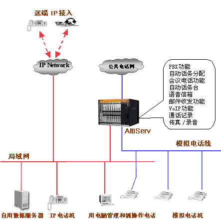 用很少的投資搭建一個以Altiserv為中心的網(wǎng)絡(luò)電話系統(tǒng)可以基本滿足企業(yè)的辦公, 數(shù)字、語音及多媒體通訊的全方位需求。而且隨著您企業(yè)的不斷發(fā)展壯大,奧迪堅(jiān)隨時可為您增加任何您所需的功能。