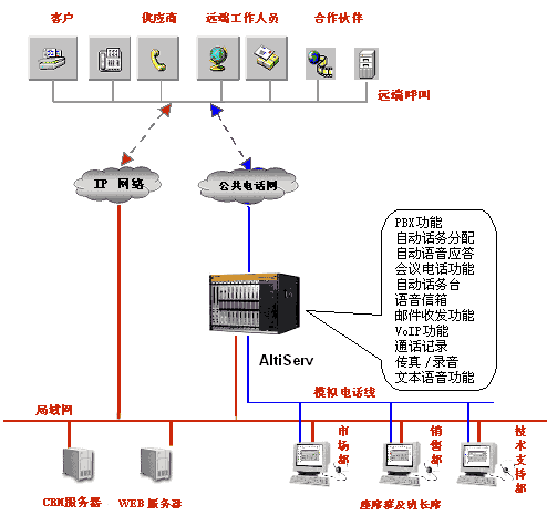奧迪堅(jiān)呼叫中心平臺(tái)在一臺(tái)服務(wù)器(AltiServ)上整合了所有常用呼叫中心的功能,并提供與CRM軟件的接口平臺(tái),從而真正提升客戶滿意度,提高企業(yè)本身的盈利能力。