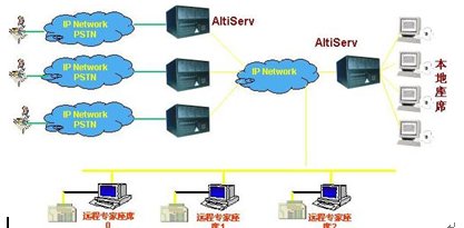 這種組合節(jié)省管理成本,因?yàn)樗械淖瘑T都在一點(diǎn),便于管理控制,同時(shí)用戶只要撥打本地電話即可進(jìn)入系統(tǒng)接收服務(wù),如需人工座席應(yīng)答的話系統(tǒng)會(huì)自動(dòng)將來電通過Internet轉(zhuǎn)接到座席員處,對(duì)公司的話費(fèi)成本也較低(都是通過Internet實(shí)現(xiàn)的長(zhǎng)途轉(zhuǎn)接功能)。同時(shí)AltiGen也支持通過IP分機(jī)的方式遠(yuǎn)程登錄到系統(tǒng)實(shí)現(xiàn)遠(yuǎn)程座席的功能,這樣對(duì)有些高級(jí)話務(wù)員或?qū)<易,不必每天到公司上班,可以通過家里的電腦登錄到AltiGen系統(tǒng),作為系統(tǒng)的一個(gè)分機(jī)來完成所有的座席員的功能,在他的電腦屏幕上也能彈出來電人的信息。系統(tǒng)的組網(wǎng)圖如下: