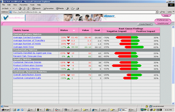 IntelliMiner使用專利的數(shù)據(jù)挖掘技術(shù),自動(dòng)分析導(dǎo)致呼叫中心關(guān)鍵行為指標(biāo)(KPI)和呼叫中心設(shè)定目標(biāo)的因素及其關(guān)系和影響。所分析的數(shù)據(jù)揭示了導(dǎo)致呼叫中心KPI表現(xiàn)的潛在原因,例如過長的通話時(shí)間,過多的轉(zhuǎn)接次數(shù),過長的保持時(shí)間,降低生產(chǎn)力和降低客戶滿意度。針對分析的結(jié)果,用戶可以去回放相關(guān)的呼叫,找到導(dǎo)致這些因素的原因所在。