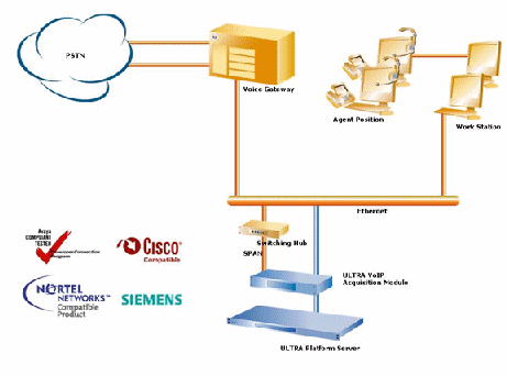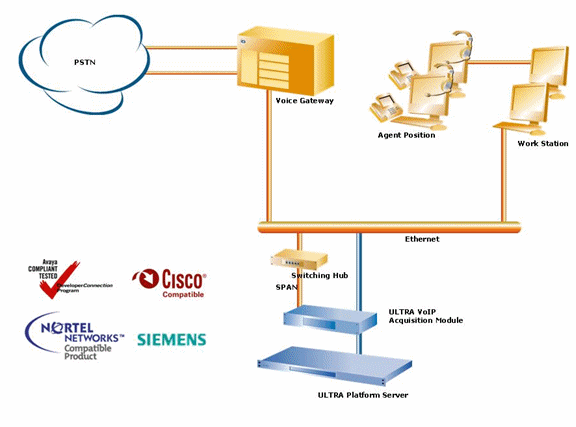 ULTRA平臺的VoIP錄音方案可真正實(shí)現(xiàn)純軟件解決方案,可由客戶自行配置符合要求的錄音服務(wù)器,安裝ULTRA平臺的軟件即可。另外,對于不能提供具備SPAN功能的網(wǎng)絡(luò)使用環(huán)境,ULTRA平臺也可提供相應(yīng)的模塊產(chǎn)品(ULTRA