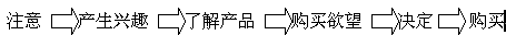 另外在其它的銷售渠道上,如電視、廣播、報(bào)紙等,他們對市場目標(biāo)的準(zhǔn)確度都是不高的,因?yàn)檫@樣的原因,也無法對目標(biāo)市場作掌控和測試,雖然他們可以很快速的擴(kuò)展市場,對市場產(chǎn)生很大的響應(yīng)力,但如果沒有很好的市場營銷與品牌整體性和長期性規(guī)劃,也很快的會(huì)變成曇花一現(xiàn),歷史中的記憶,這些渠道的成本也是最高的,所以不是所有的企業(yè)都能一體適用的,尤其是中小型企業(yè)是無法長期負(fù)擔(dān)的。誠如在之前的文章里面分析所講的,最好的銷售效果是一拉一推的力量,用多媒體感官性及理性的獲取消費(fèi)者的注意力,再配合快速效能的主動(dòng)銷售,往往能將營銷的效果提升到最高的層面。將到這兒,就不得不順帶提到消費(fèi)者購買的行為模式。我們將消費(fèi)者對購買的心理和行為分為幾個(gè)階段: