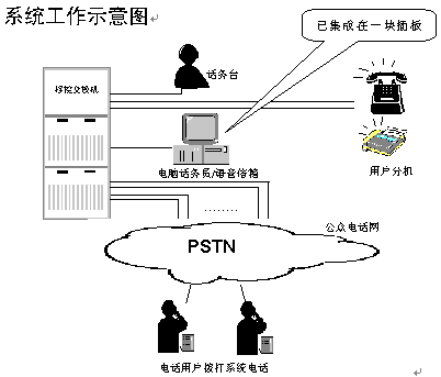 該系統(tǒng)可作為程控交換機(jī)銷售商的配套模塊配給新用戶,也可用于電力、院校、企業(yè)集團(tuán)、政府機(jī)關(guān)等已擁有交換機(jī)的單位加配電腦話務(wù)員和語(yǔ)音信箱及114查號(hào)臺(tái)功能。