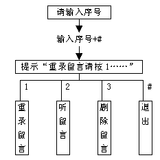 3). 若輸入的分機(jī)信箱號(hào)碼正確,此時(shí)系統(tǒng)會(huì)提示用戶"留言請(qǐng)按1,主人訪問請(qǐng)按2",按1后即可給該信箱留言。