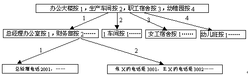 舉例 如某單位分機(jī)號(hào)碼結(jié)構(gòu)如下所示,該單位的查號(hào)臺(tái)序號(hào)可分三級(jí):