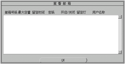 1). 您可修改的參數(shù)有:用戶名稱、用戶密碼、信箱容量、最大留時(shí)長(zhǎng)、開啟/關(guān)閉、點(diǎn)留言燈。有關(guān)參數(shù)的細(xì)節(jié)將在增加信箱一節(jié)中介紹。