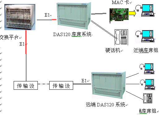 DAS120交換平臺采用1-4個E1連接,可以簡潔實(shí)現(xiàn)PCM信號轉(zhuǎn)模擬信號引出到座席。E1接口的信令可選配為隨路信令CAS和透明通道Clear Channel。E1可通過光端機(jī)、微波、HDSL等設(shè)備來傳輸,從而實(shí)現(xiàn)分布式組網(wǎng)。