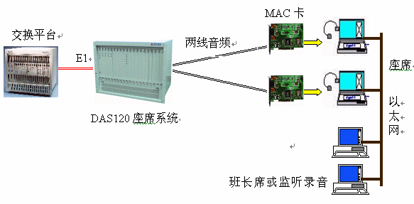 DAS120與億景座席卡MAC配合使用,可使系統(tǒng)的優(yōu)越性發(fā)揮到最大。MAC卡提供的強(qiáng)大功能(收發(fā)DTMF和450HZ信號音,語音錄放等)有效地簡化系統(tǒng)軟件的設(shè)計,并可降低系統(tǒng)成本,如EXCEL交換平臺可不用配置DSP卡,IVR可簡化等。還可以有效地降低交換平臺的處理負(fù)荷,提高話務(wù)處理能力。