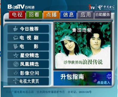 上海IPTV點(diǎn)播節(jié)目達(dá)3000小時(shí),包括電影、電視劇、音樂(lè)娛樂(lè)、紀(jì)實(shí)節(jié)目、少兒、體育以及教育等欄目。點(diǎn)播節(jié)目改變了“你播我看”的電視被動(dòng)接受方式,讓用戶(hù)可以根據(jù)自己的喜好來(lái)選擇喜愛(ài)的個(gè)性化節(jié)目,大大提高了用戶(hù)的喜愛(ài)度。值得一提的是,當(dāng)收看電影中途退出的時(shí)候,系統(tǒng)提供了“書(shū)簽”功能,下一次收看時(shí),便可以從書(shū)簽處繼續(xù),方便用戶(hù)使用和體驗(yàn)。另外,系統(tǒng)提供的“搜索”功能也讓百姓眼前一亮,尋找自己喜愛(ài)的影片就更方便了。