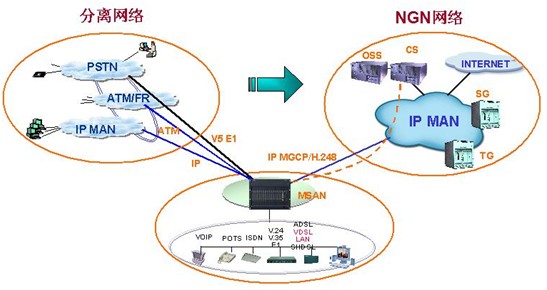 隨著運營商光進銅退大潮的推進,融合了寬帶和傳統(tǒng)窄帶接入、同時支持PSTN和NGN的MSAN綜合接入設備成為運營商網(wǎng)絡建設的新熱點。MSAN的應用可以降低運維成本,提升業(yè)務投放的靈活度,有助于運營商從傳統(tǒng)固網(wǎng)運營商向多業(yè)務運營商的角色轉變。MSAN的引入不但可以充分兼容現(xiàn)有的PSTN、ATM以及IP網(wǎng)絡、提供TDM語音、窄帶數(shù)據(jù)業(yè)務、寬帶業(yè)務和視頻業(yè)務的綜合接入,還可以適用于未來的NGN,提供VoIP業(yè)務。