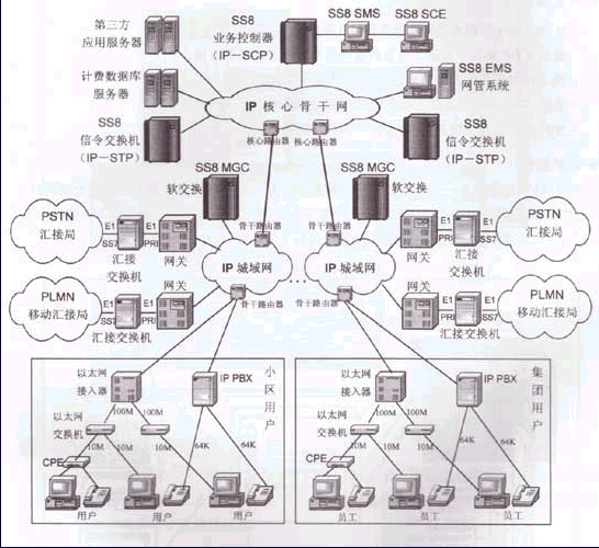 如同七號信令系統(tǒng)(SS7)在PSTN中所起到的作用一樣,SS8提供了面向Internet以及集團(tuán)單位內(nèi)部跨地域的Intronet的通信信令與解決方案。如廣電、銀行、公檢法、工商、稅務(wù)等跨地域性的集團(tuán)單位內(nèi)部計算機網(wǎng)絡(luò)或租賃某些骨干網(wǎng)絡(luò)所覆蓋范圍內(nèi)的語音通信服務(wù)。從而極大的降低集團(tuán)單位業(yè)務(wù)通信的成本。以下將對SS8系統(tǒng)產(chǎn)品的主要功能以及它在廣電網(wǎng)絡(luò)中應(yīng)用的益處和推廣應(yīng)用的建議說明如下: