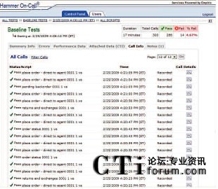 只需使用一個(gè)簡(jiǎn)單易用的Web接入就可以和Empirix測(cè)試小組一起實(shí)時(shí)跟蹤測(cè)試進(jìn)度。此外,還同時(shí)可以查看測(cè)試結(jié)果、發(fā)生失敗的類(lèi)型和導(dǎo)致失敗發(fā)生的測(cè)試流量。通話(huà)全程記錄功能可以用來(lái)記錄相關(guān)通話(huà),從而捕獲和幫助診斷發(fā)生失敗的根源?梢詤⒖枷铝袌D表: