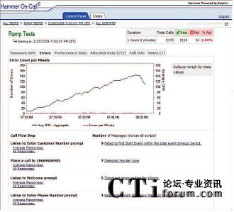 Hammer On-Call IVR測(cè)試使用各種各樣的主叫場(chǎng)景模擬真實(shí)世界用戶(hù)交互。通過(guò)改變呼叫量和呼叫場(chǎng)景的混合,Empirix測(cè)試專(zhuān)家可以生成指向IVR的模擬真實(shí)世界的呼叫流量。此外,在測(cè)試中,不同的呼叫測(cè)試點(diǎn)上可以使用不同的呼叫率。在測(cè)試過(guò)程中經(jīng)常會(huì)用到三種基本呼叫模型及其變體。基本測(cè)試是使用一個(gè)恒定的低呼叫率檢驗(yàn)被測(cè)環(huán)境是否已準(zhǔn)備好接受呼叫;增量測(cè)試是使用一個(gè)固定增量穩(wěn)步增加呼叫量一直到達(dá)峰值呼叫量,然后,增加呼叫量直至超過(guò)期望值,檢驗(yàn)系統(tǒng)在峰值時(shí)段內(nèi)是否有額外容量;最后,‘浸透’測(cè)試是在指定的時(shí)段內(nèi)使用一個(gè)恒定的高呼叫率檢驗(yàn)系統(tǒng)穩(wěn)定性。