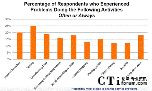 調查顯示,超過2/3的美國智能手機用戶從事一些最常見的活動時,遭遇了網(wǎng)絡服務問題,包括互聯(lián)網(wǎng)搜索、數(shù)據(jù)下載、搜尋或觀看視頻和社交網(wǎng)絡。此外,在調查中發(fā)現(xiàn),當他們遇到服務和中斷問題時,消費者把責任歸罪于他們的移動網(wǎng)絡運營商商(MNO)。事實上,幾乎所有被調查的智能手機用戶的一半,由于他們的體驗問題抱怨他們的移動網(wǎng)絡運營商商(MNO)。