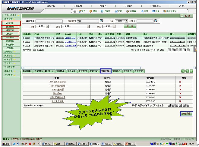 和傳統(tǒng)日程相比,傳統(tǒng)日程是不和客戶掛鉤的,事后查閱很不方便,就好比在一個(gè)筆記本上去查詢以前的筆記,要找出與某個(gè)客戶的日程安排,根本不可能,而且,很多人的備忘錄寫了之后,也不會(huì)再去翻閱了。有了客戶相關(guān)聯(lián)的日程后,以后通過客戶為入口,可以很清楚的查閱XX時(shí)候,XX人和該客戶交往的日程安排及記錄。