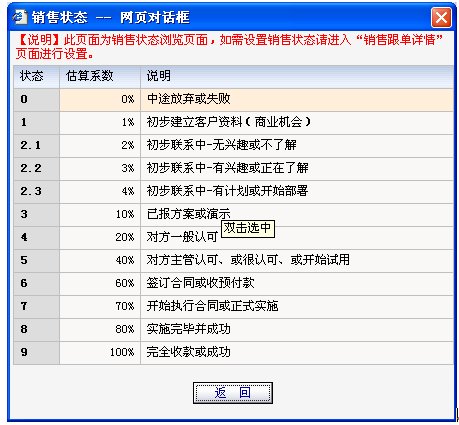 銷售過程量化管理,即對(duì)銷售活動(dòng)進(jìn)展的數(shù)字化。從目標(biāo)客戶建立到簽約成交的過程中,按客戶需求變化以及我們提供咨詢的不同來分成若干個(gè)階段,我們把這些不同的階段描述出來,并用一個(gè)數(shù)字或百分比來替代。如:10%指的是客戶有這方面的需求意向,但對(duì)我們并沒有特別的關(guān)注;50%即可以表示需求強(qiáng)烈并偏愛于我們;而70%則可能到了談合作的相關(guān)條款等。這樣就讓本來靜止在紙上的業(yè)務(wù)報(bào)告變成了動(dòng)態(tài)的分析數(shù)據(jù)。