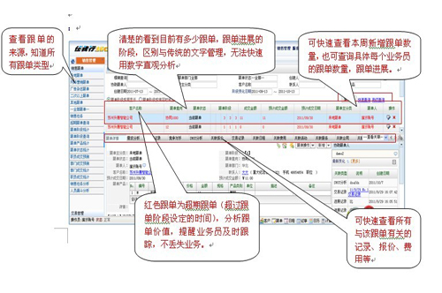 2、通過(guò)軟件對(duì)跟單的業(yè)務(wù)進(jìn)展記錄固化,清晰掌握該跟單由誰(shuí)創(chuàng)建、誰(shuí)去談單、報(bào)價(jià)有無(wú)競(jìng)爭(zhēng)對(duì)手、有無(wú)難點(diǎn)等進(jìn)展一覽無(wú)余,避免了傳統(tǒng)的電話、面對(duì)面溝通。