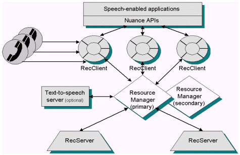 在特定配置下,呼叫控制和提示回放由Nuance系統(tǒng)外的組件控制,RecClient也可用于偷聽模式。最后,RecClient將音頻傳給識(shí)別服務(wù)器(RecServer),并將事件和結(jié)果回傳給應(yīng)用程序。