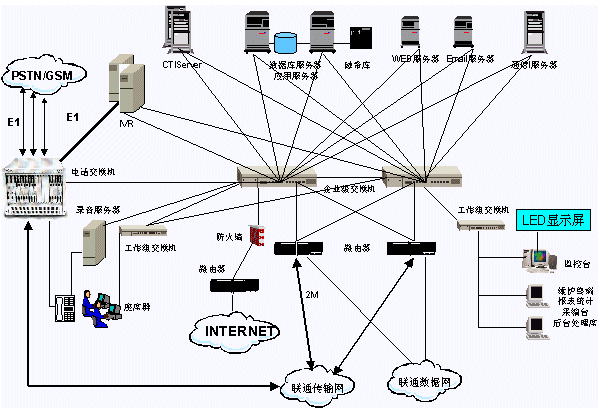 用戶撥打聯(lián)通客戶服務(wù)系統(tǒng)特服號(hào)碼1001,呼叫經(jīng)過(guò)電話網(wǎng)絡(luò)匯接到省中心匯接局,然后接入本系統(tǒng)。本系統(tǒng)的呼叫匯接采用《中國(guó)聯(lián)通客戶服務(wù)系統(tǒng)技術(shù)規(guī)范書(shū)》規(guī)定的匯接方式。