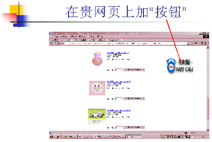 簡單地說,就是當(dāng)有客戶瀏覽到網(wǎng)上購物的網(wǎng)頁時,若有任何疑問或想立即購買,只要點擊在網(wǎng)頁上的“按鈕”鍵,就可以直接接通到網(wǎng)站的客服中心,實現(xiàn)即時地語音互動。也不需再像以前那樣發(fā)E-MAIL或撥電話號碼了。效果可謂是立竿見影。(如圖示)