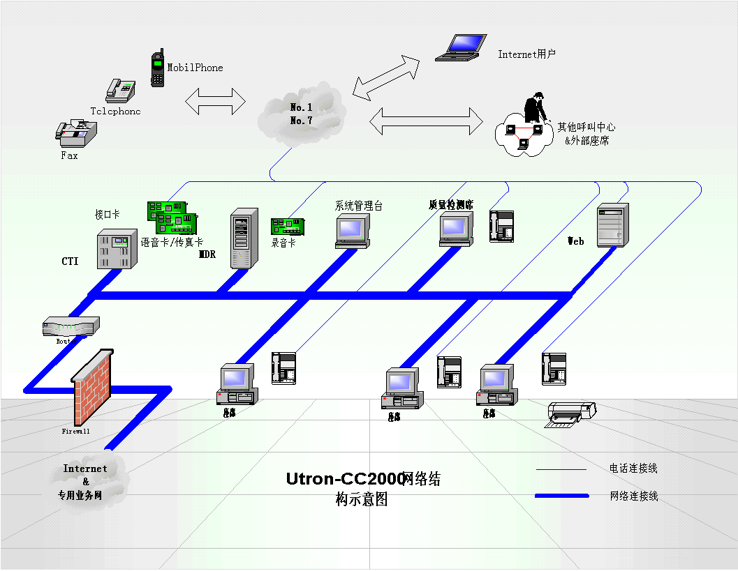 。。Utron-CC2000呼叫中心平臺是一個集語音技術(shù)、通信技術(shù)、計算機(jī)網(wǎng)絡(luò)、數(shù)據(jù)庫技術(shù)于一體,基于分布式對象提供的全方位綜合信息,支持傳統(tǒng)電話、傳真、電子郵件、Web等多種媒體接入方式的呼叫智能響應(yīng)中心。