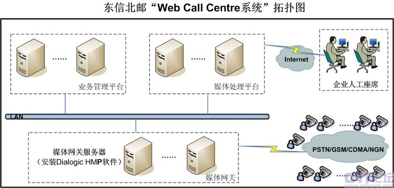 隨著中國經(jīng)濟的快速發(fā)展,越來越多的企業(yè)尤其是中小企業(yè)對呼叫中心的需求量越來越大,需求質量也越來越高。由于呼叫中心建設涉及技術十分專業(yè)、涉及領域也比較廣泛、必須投入巨大的資金購買軟硬件設備,并且需要大量的維護力量,因此對于中小企業(yè),尤其是缺乏專業(yè)技術力量和資金的中小企業(yè)來說,建設自有的呼叫中心顯得不切實際。正是基于這種情況,EB開始與Dialogic合作,采用其HMP系統(tǒng)軟件,以IP技術為基礎,依托電信網(wǎng)絡,建設呼叫中心系統(tǒng),以托管方式為客戶提供呼叫中心服務,即Web Call Centre服務。