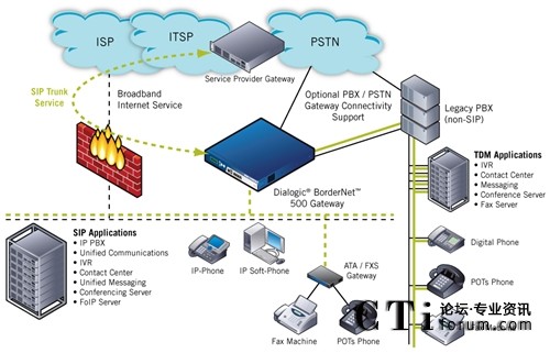 圖:企業(yè)網(wǎng)絡(luò)中的Dialogic® BorderNet™ 500網(wǎng)關(guān)