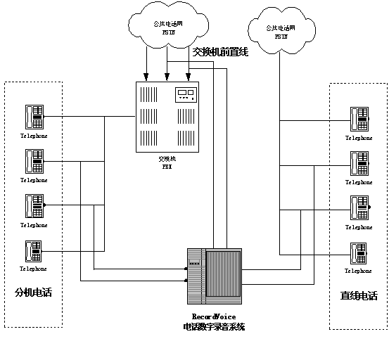 語音卡的模擬線接口和排隊機/交換機的模擬中繼并聯(lián),錄音工作站主要針對外線話音進行錄音。