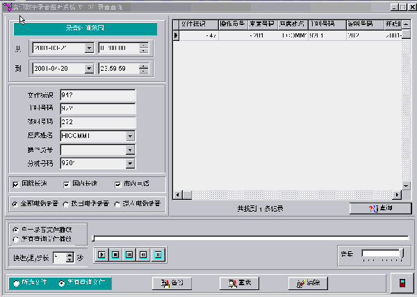系統(tǒng)管理員可以對任一時間、任一電話的錄音進行查詢。系統(tǒng)對每一次錄音都詳細記載了通話開始時間、結束時間、主叫或被叫號碼、通話的線路等,當系統(tǒng)管理員在選中了某一條錄音后,可以進行即時播放。