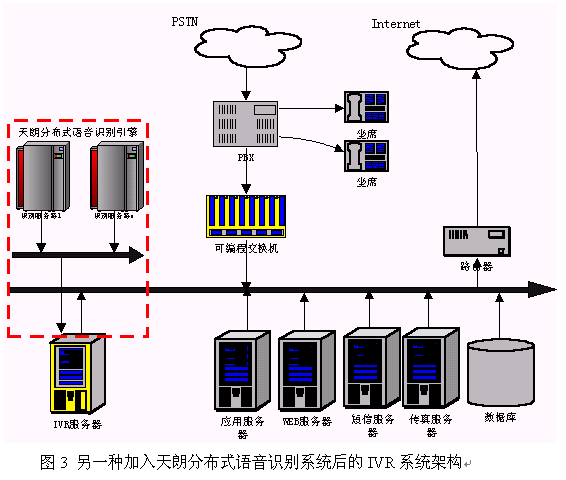 硬件連接:天朗分布式語音識別系統(tǒng)是通過局域網(wǎng)來把客戶端和服務器連在一起。因此在硬件上把天朗分布式語音識別系統(tǒng)聯(lián)入到IVR的一種簡單的辦法是把引擎的所有服務器接入到系統(tǒng)現(xiàn)有的局域網(wǎng)中,使得識別服務器能和IVR服務器通過TCP/IP通訊即可。連接后的系統(tǒng)架構(gòu)可以用圖2來表示。