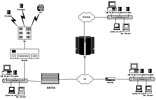 該應用示意圖具有一個(iPBX )或多個辦公場地(nIPBX - 組網(wǎng)iPBX )提供電話系統(tǒng)解決方案。該解決方案是基于IP 電話技術(shù)而構(gòu)建的Tw-IPBX “一體化概念”,同時可提供傳統(tǒng)的模擬電話概念,如模擬電話和傳真機。以下敘述了客戶機組合的單獨應用場景,包括: