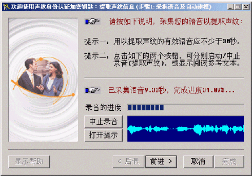 提示:如果原來(lái)已經(jīng)提取過(guò)該用戶的聲紋信息,且在"聲紋信息的提取"步驟一的窗口上不點(diǎn)擊"提取聲紋"而直接點(diǎn)擊"前進(jìn)"按鈕,將使用舊的聲紋信息,而僅更新"錄音音量"和"嚴(yán)格程度閾值"的設(shè)置。