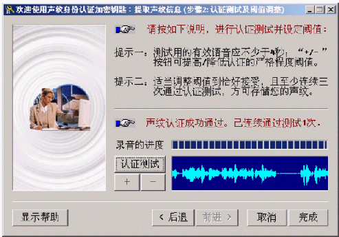 點(diǎn)擊"認(rèn)證測(cè)試"按鈕并說(shuō)出含有4秒有效語(yǔ)音的任意一段話,系統(tǒng)據(jù)此進(jìn)行身份認(rèn)證,并顯示在當(dāng)前的"嚴(yán)格程度閾值"下的認(rèn)證結(jié)果("通過(guò)"或"被拒絕")。根據(jù)這個(gè)結(jié)果,可利用"+/-"按鈕將這個(gè)閾值適當(dāng)?shù)卣{(diào)高(如果結(jié)果是"通過(guò)")或調(diào)低(如果結(jié)果是"拒絕")一些或不做調(diào)整。請(qǐng)注意:該閾值越大,后續(xù)的聲紋認(rèn)證就越嚴(yán)格,反之則越寬松。